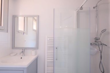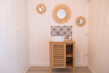 L’appartement de 48 m² dispose de deux chambres : une au rez-de-chaussée avec un lit double en 140 cm, et une autre à l’étage avec deux lits de 90 cm dans la mezzanine, modulables pour s’adapter à vos besoins. Une salle d’eau avec WC complète ce niveau.
