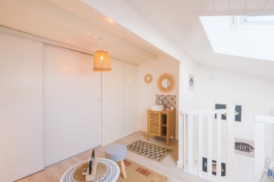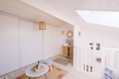 La mezzanine offre un espace de détente ou de jeux, idéal pour se poser après une journée à la plage.