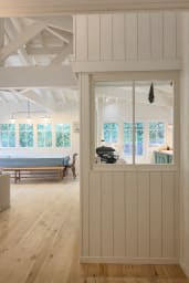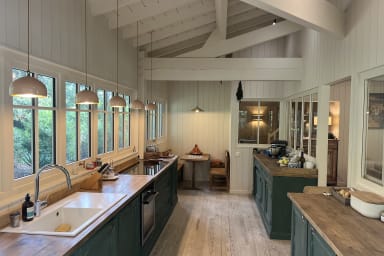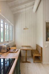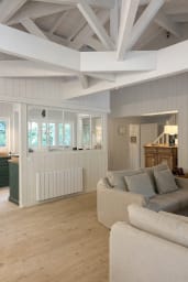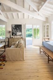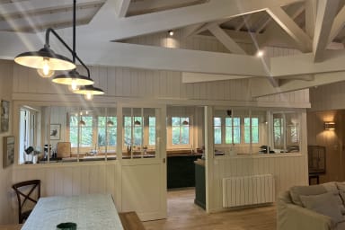 La vaste pièce de vie se compose d’un salon avec 2 canapés et des fauteuils, d’un espace salle à manger avec grande table bois et bancs, une spacieuse cuisine entièrement équipée avec espace dinatoire, séparée et pouvant être indépendante grâce à une très belle verrière. L’ensemble est baigné de lumière et tourné vers l’extérieur.