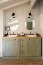Au niveau inférieur, 2 suites supplémentaires avec chacune un lit en 160 cm, rangements, sa douche privative et son lavabo. Elles ont accès au jardin. Un espace buanderie ainsi qu’un congélateur agrémentent ce rez-de-jardin.