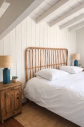 L’étage supérieur offre une spacieuse suite parentale avec lit en 180cm, plusieurs rangements et sa salle de bains privative avec douche à l’italienne, baignoire et meuble double vasque. Cette suite dispose d’un ventilateur de plafond silencieux, et bénéficie d’un aperçu Bassin.